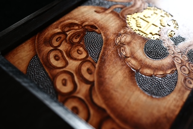 The first piece we are showcasing today is called the “Kraken Everyday Tray”, which was a collaboration project with Copper Pig Fine Woodworking. I wanted to capture the twisting and clutching of the arms around the piece of stolen treasure.